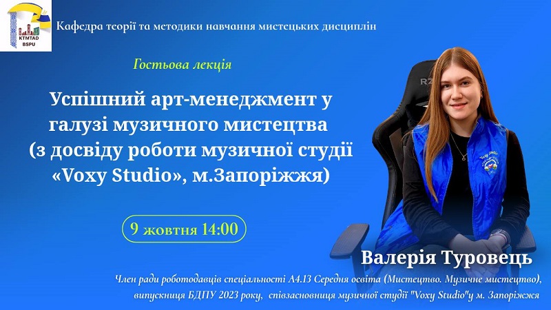9-го жовтня 2025 року на кафедрі теорії та методики навчання мистецьких дисциплін (завідувачка к.пед.н., доцентка Олена Бузова) відбулась гостьова лекція для здобувачів спеціальності А4.13 Середня освіта (Мистецтво. Музичне мистецтво) на тему «Успішний арт-менеджмент у галузі музичного мистецтва (з досвіду роботи музичної студії «Voxy Studio»)» від випускниці ОП Середня освіта (музичне мистецтво та англійська мова) 2023 року, члена ради роботодавців спеціальності А4.13 Середня освіта (Мистецтво. Музичне мистецтво) Валерії Туровець та співзасновника музичної студії Андрія Туровець.