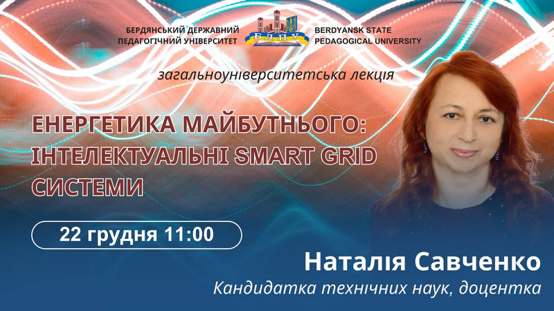22 грудня 2025 року до Дня енергетика України кандидаткою технічних наук, доценкою кафедри професійної освіти та технологій Бердянського державного педагогічного університету Наталєю Савченко проведено загальноуніверситетську лекцію «Енергетика майбутнього: Інтелектуальні Smart Grid системи».