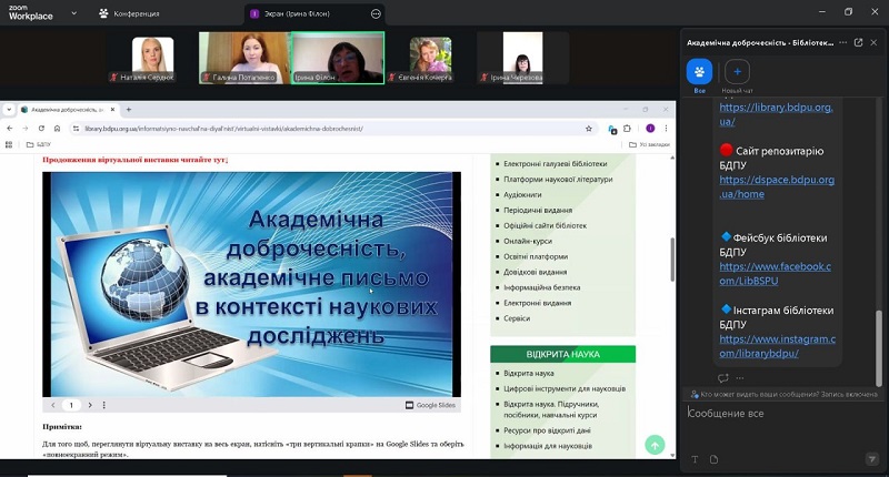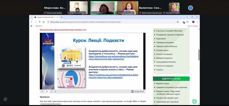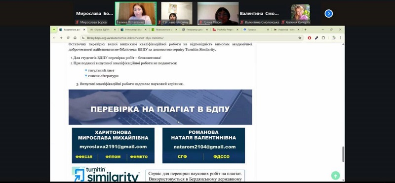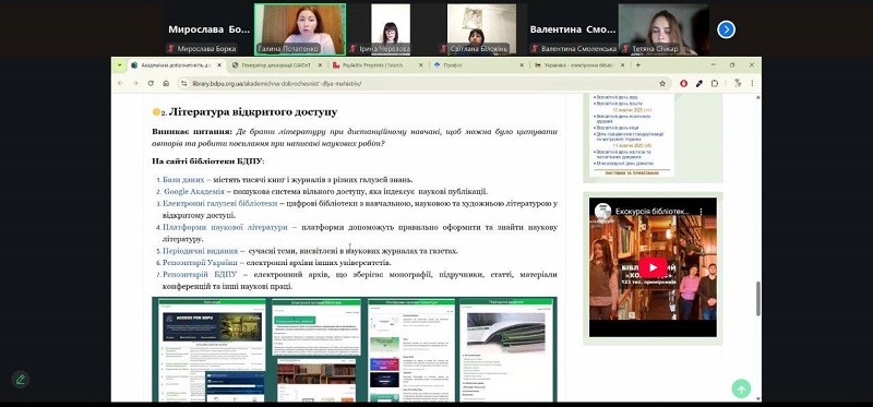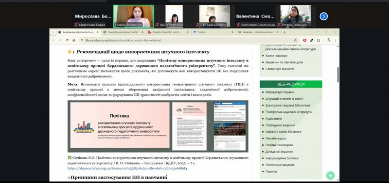 Розпочала зустріч провідна бібліотекарка Галина Потапенко, яка висвітлила основні положення Політики використання ШІ в БДПУ; акцентувала увагу на принципах застосування ШІ в навчанні, ризиках та наслідках його використання; представила алгоритм роботи з декларацією розкриття внесків ШІ GAIDeT. Бібліотекарка “провела” присутніх по базам даних бібліотеки, зупинилася на репозитарії БДПУ та його фондах, окремо висвітлила питання плагіату в наукових роботах.