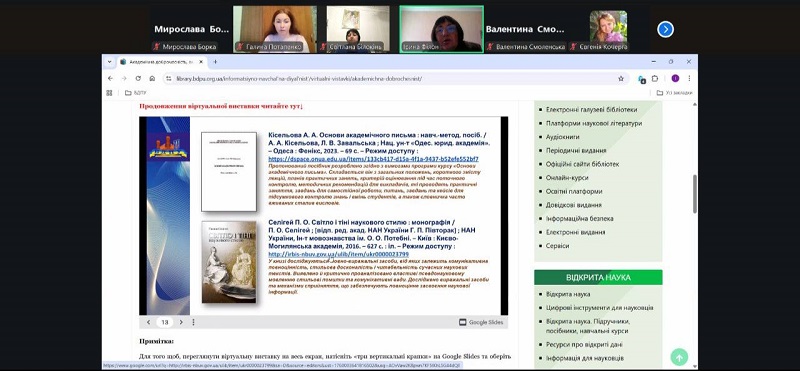 Завідувачка відділу обслуговування бібліотеки Ірина Філон познайомила присутніх з науковими джерелами з питань академічної доброчесності та академічного письма в контексті наукових досліджень. Окрему увагу було приділено практичним посібникам, які допомагають науковцю-початківцю увійти та заглибитися в цікавий світ науки.