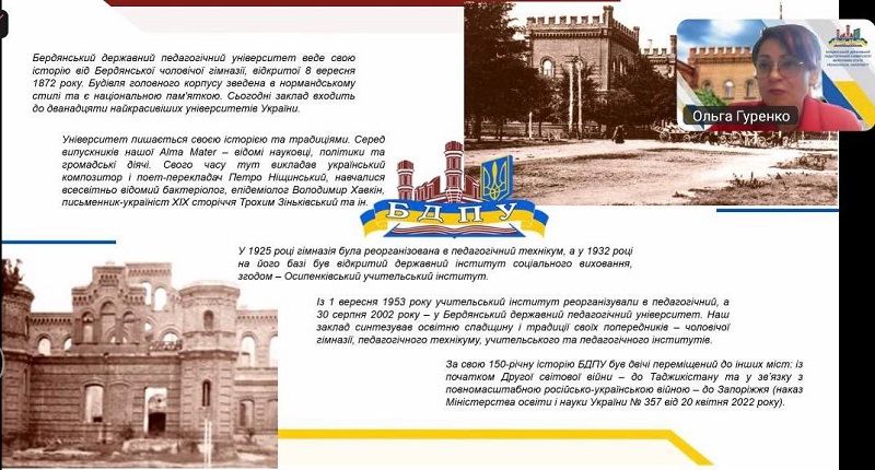 An inspiring lecture, “Berdyansk State Pedagogical University – The Heart of the Azov Region” (watch here), was delivered by Professor Olha Hurenko, First Vice-Rector of BDPU. She shared the history of the university, its key activities, and achievements under current circumstances.