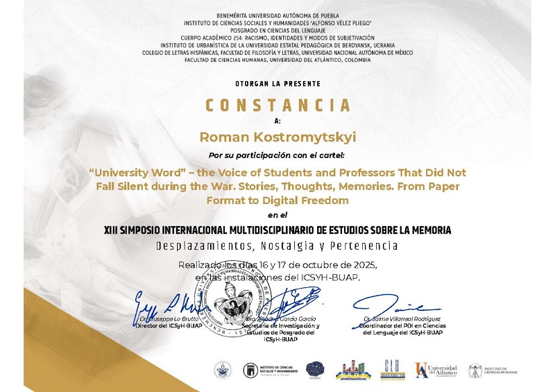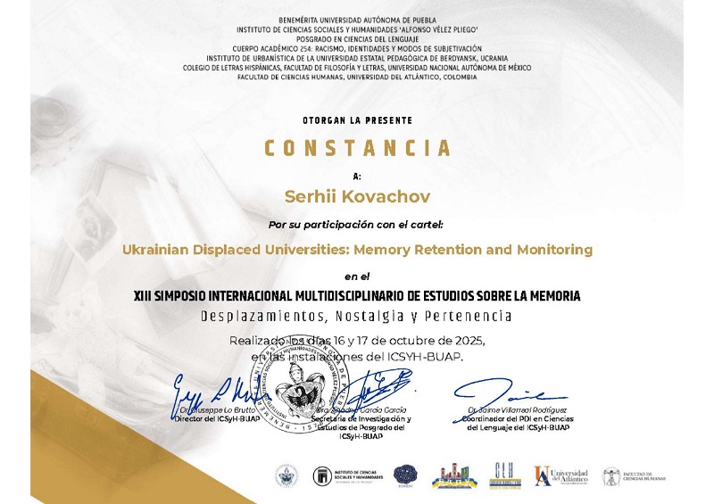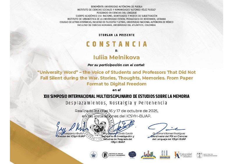 Цього року Інститут соціальних і гуманітарних наук “Альфонсо Велес Плієго” Заслуженого Автономного Університету Пуебла і Науково-дослідний інститут історичної урбаністики Бердянського державного педагогічного університету вже втринадцяте виступили співорганізаторами Міжнародного Симпозіуму з Мультидисциплінарного Вивчення Пам’яті (SIMEM ХІІІ), який відбувся у Мексиці.