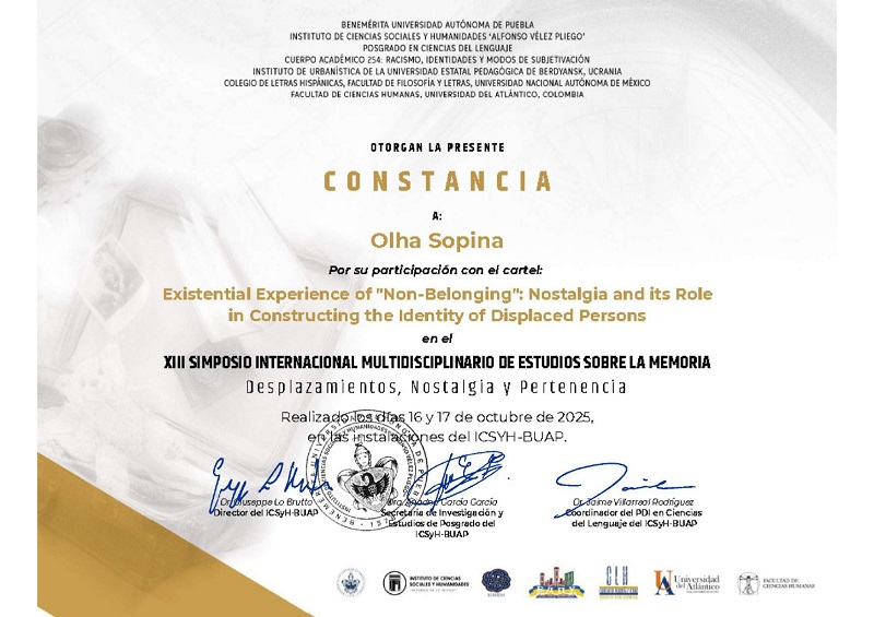 - Olha Sopina(associate professor of Berdyansk State Pedagogical University, Ukraine), Arsenii Melnikov (student of Berdyansk State Pedagogical University, Ukraine) Existential Experience of “Non-Belonging”: Nostalgia and its Role in Constructing the Identity of Displaced Persons