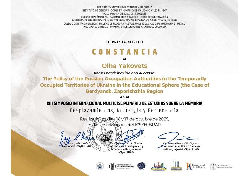 - Marina Antoshak(associate professor of Berdyansk State Pedagogical University, Ukraine), Olha Yakovets(History teacher of Novoselyvskyi Lyceum, Ukraine) The Policy of the Russian Occupation Authorities in the Temporarily Occupied Territories of Ukraine in the Educational Sphere (the Case of Berdyansk, Zaporizhzhia Region)