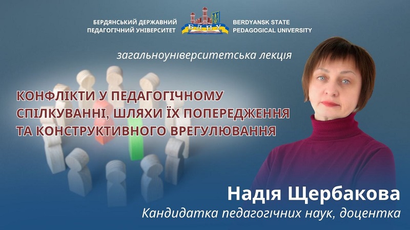 27 березня відбулася загальноуніверситетська відкрита лекція кандидатки педагогічних наук, доцентки кафедри педагогіки факультету психолого-педагогічної освіти та мистецтв Бердянського державного педагогічного університету Надії Щербакової на тему «Конфлікти у педагогічному спілкуванні, шляхи їх попередження та конструктивного врегулювання».