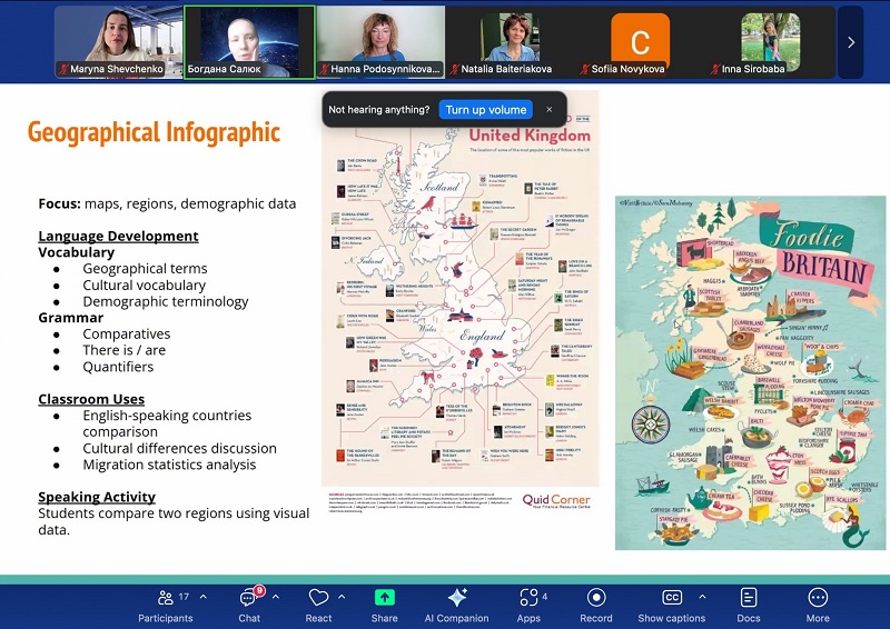 Під час лекції було розглянуто можливості використання візуалізації даних у процесі навчання англійської мови як інструменту розвитку мовленнєвих, аналітичних та цифрових компетентностей учнів. Учасники ознайомилися з різними типами інфографіки (статистичною, інформаційною, хронологічною, процесуальною, географічною, порівняльною, ієрархічною, тощо) та їхнім методичним потенціалом у формуванні лексичних, граматичних і комунікативних навичок. Також увагу було приділено використанню діаграм і графіків для розвитку академічного мовлення, зокрема опису тенденцій, порівняння даних і підготовки до міжнародних іспитів.