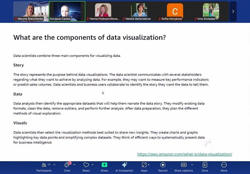 У межах лекції обговорювалися когнітивні засади ефективності візуалізації, зокрема ідеї поєднання вербального та візуального каналів сприйняття інформації, зменшення когнітивного навантаження та підвищення рівня запам’ятовування навчального матеріалу. Було наголошено, що візуалізація даних у навчанні англійської мови сприяє розвитку критичного мислення, уміння інтерпретувати інформацію та формувати аргументовані висловлювання.