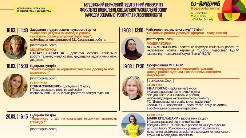 У межах відзначення професійно важливої дати кафедра соціальної роботи та інклюзивної освіти організувала серію тематичних заходів, що відобразили ідею єднання та спільного творення. Спікерами більшості заходів цьогоріч стали здобувачі вищої освіти спеціальності І10 Соціальна робота та консультування, які активно ділилися досвідом волонтерства, професійної діяльності у галузі соціальної роботи, особистим досвідом подолання соціальних викликів.