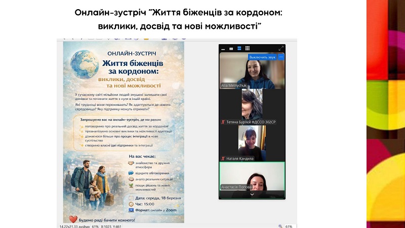 Рефлексія Софії щодо проведеного заходу: “Проведення онлайн-заходу на тему життя біженців за кордоном стало для мене не просто навчальним завданням, а й цінним досвідом. Захід пройшов у теплій та відкритій атмосфері. Було відчуття, що ця тема відгукується кожному, адже вона не є далекою чи абстрактною — це реальність, з якою сьогодні стикається багато людей.