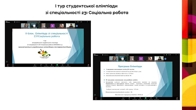 Продовженням запланованих активностей стало проведення І туру студентської олімпіади зі спеціальності 231 Соціальна робота (19 березня) (модераторка — доцентка Наталя Захарова), до участі в якій долучилися здобувачі усіх курсів денної та заочної форм здобуття вищої освіти. Програма олімпіади була побудована таким чином, щоб максимально охопити як теоретичну, так і практичну складові підготовки майбутніх фахівців. Учасники виконували тестові завдання та розв’язували ситуаційні кейси, що моделювали реальні виклики соціальної роботи.