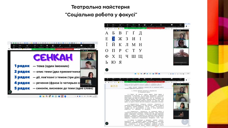 Родзинкою серед запланованих заходів стало проведення театральної майстерні “Соціальна робота у фокусі” (20 березня) (модераторка – асистентка, засновниця театральної студії “Зміни” Алла Мельничук) у форматі театру-газети. Через прості, на перший погляд, вправи, що поєднували елементи театральної майстерності та професійної рефлексії, учасники занурювалися у процес самоусвідомлення та самопрезентації, осмислення професійної ролі соціального працівника, командної взаємодії та спільного творення. Робота з мовою, образами дозволила актуалізувати важливі аспекти професійної діяльності соціальних працівників – емпатію, гнучкість мислення, креативність та здатність до комунікації.