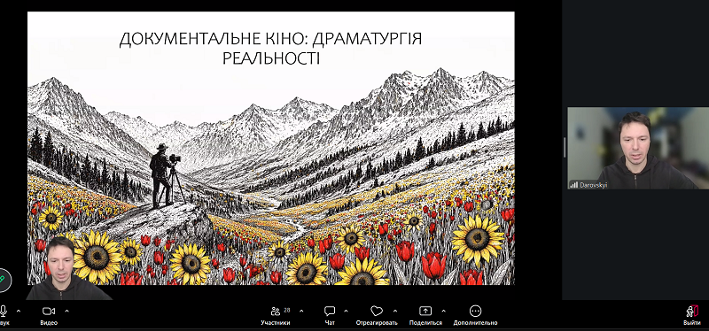 On April 18, 2026, the Department of Ukrainian Language and Journalism organized an exceptionally interesting and informative lecture on the world of non-fiction cinema, titled “Documentary Film: The Dramaturgy of Reality.” The invited lecturer for the event was Ihor Darovskyi, an experienced director and screenwriter who has been working in the video-making industry since 2006. Currently, Mr. Darovskyi serves as a press officer for a unit of the Air Forces of the Armed Forces of Ukraine, which added significant weight and acute relevance to the conversation amidst the full-scale invasion. The meeting was moderated by Roman Kostromytskyi, PhD in Philology and Associate Professor, who helped participants dive deeper into the specifics of the material through a live dialogue format.