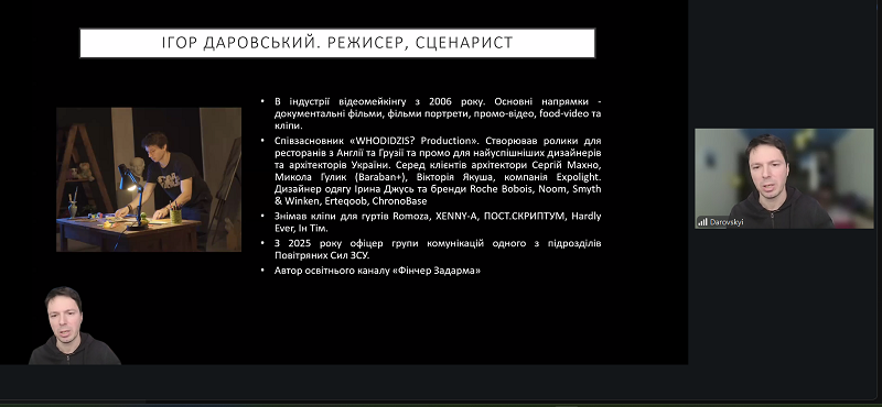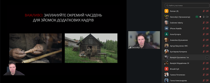 Great attention was paid to the “kitchen” of plot creation. Ihor emphasized that the dramaturgy of reality is based on the ability to build a clear structure and utilize plot tropes that hold the audience’s attention until the very last second. They also discussed the importance of creating atmosphere through details, cutaways, and soundscapes. For working with materials, the guest recommended professional software for editing and sound processing.