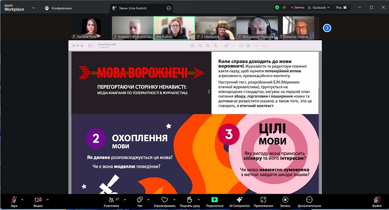 1. How to Detect Hate Speech at an Early Stage: Methodology of Recognition (Speaker: Lina Kushch, member of the CJE, First Secretary of the National Union of Journalists of Ukraine)