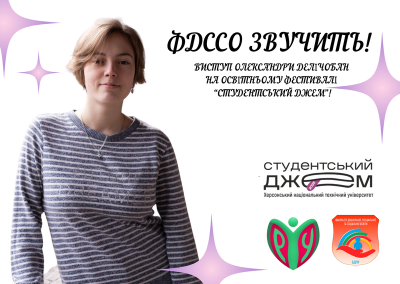Здобувачка другого (магістерського) рівня вищої освіти факультету дошкільної, спеціальної та соціальної освіти Олександра Делічобан гідно представила Бердянський державний педагогічний університет на освітньому онлайн-фестивалі «Студентський джем – 2025», організованому Херсонським національним технічним університетом.