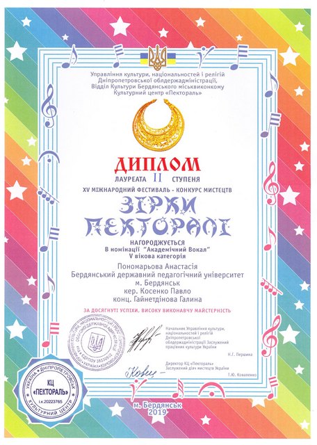 Закінчився навчальний рік, позаду семестрові будні і сесія. Та для творчих людей, якими є студенти спеціальності «Музичне мистецтво», шлях самовдосконалення не завершується – хтось присвячує багато часу грі на музичному інструменті, інший вправляється у диригентській майстерності, хтось прагне співати і випробовувати себе на різних сценах, перед різними слухацькими аудиторіями. І така нагода видається, адже початок літа у нашому місті позначається проведенням різноманітних мистецьких заходів, серед них – Міжнародний фестиваль-конкурс мистецтв «Зірки пекторалі», який цього року проходив з 19 по 23 червня.