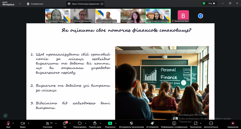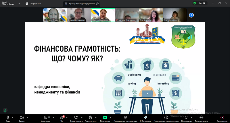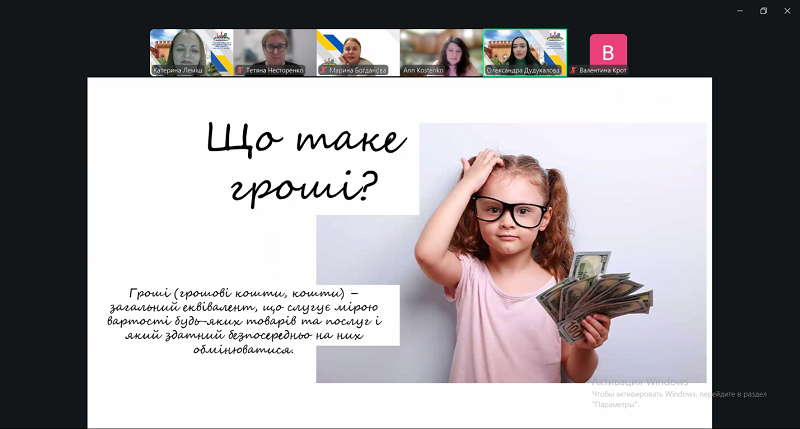 Перша частина вебінару була присвячена основам фінансової грамотності. Спікерка Олександра Дудукалова детально охарактеризувала поняття грошей, їхню роль в економічних процесах і повсякденному житті. Значний інтерес аудиторії викликала тема історії української гривні – її становлення, ключові етапи розвитку та значення як національної грошової одиниці. Завершальним акцентом виступу стало фінансове планування: учасники ознайомилися з базовими принципами формування особистого бюджету, важливістю заощаджень та раціонального розподілу фінансових ресурсів..