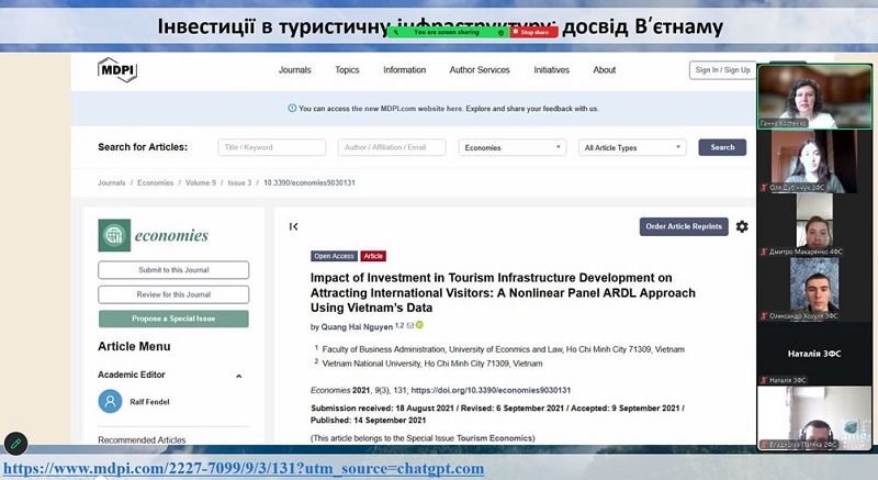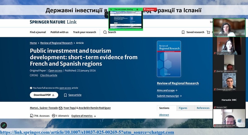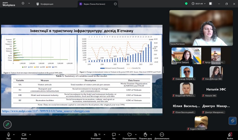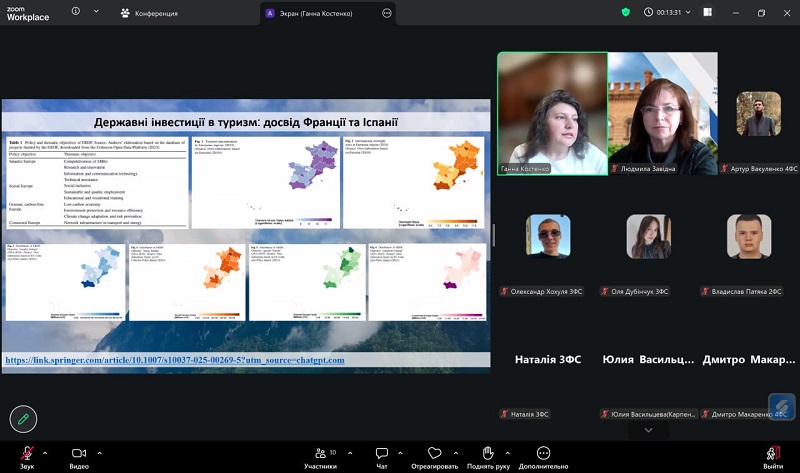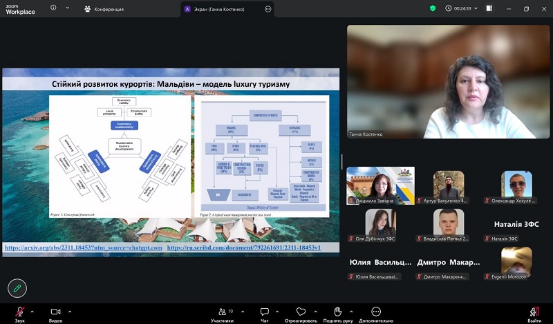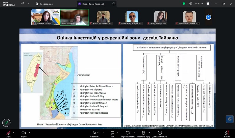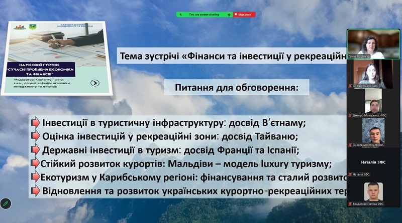 During the meeting, participants examined investments in tourism infrastructure using the example of Vietnam, where a positive impact of investments on industry development was highlighted. Particular attention was paid to the assessment of investments in recreational areas using the example of Taiwan, emphasizing the need to consider environmental and social factors. In addition, state investments in tourism in France and Spain were analyzed, confirming the important role of infrastructure and government support in enhancing the competitiveness of the tourism sector. The model of sustainable development of resorts in the Maldives, which combines a high level of service with environmental responsibility, was also discussed, along with ecotourism in the Caribbean region, focusing on the financing of environmentally oriented projects. The final stage of the meeting was devoted to discussing the prospects for the development of recreational and resort areas in Ukraine, particularly the need to attract investment, develop infrastructure, and implement international experience.