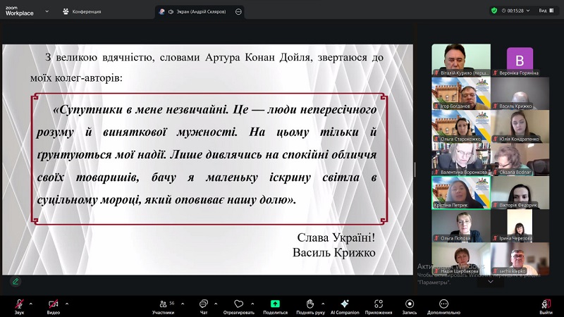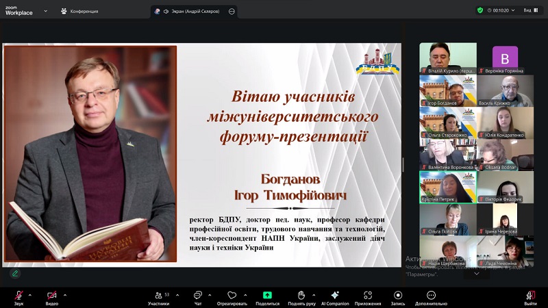 The forum brought together leading scholars, educational managers, university lecturers, and postgraduate students, including Professors Ihor Bohdanov, Oksana Bodnar, Valentyna Voronkova, Serhii Klepko, Vasyl Kryzhko, Vitalii Kurylo, Hryhorii Lutsenko, Nataliia Falko, Associate Professor Olha Starokozhko, PhD students Yuliia Kondratenko and Andrii Skliarov, and Tetiana Novosela, Acting Director of Osypenko Gymnasium, Berdyansk District.