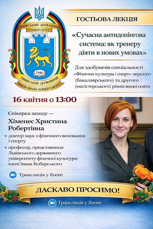 16 квітня 2026 року для здобувачів спеціальності «Фізична культура і спорт» першого (бакалаврського) та другого (магістерського) рівнів вищої освіти відбулася гостьова лекція на тему: «Сучасна антидопінгова система: як тренеру діяти в нових умовах».