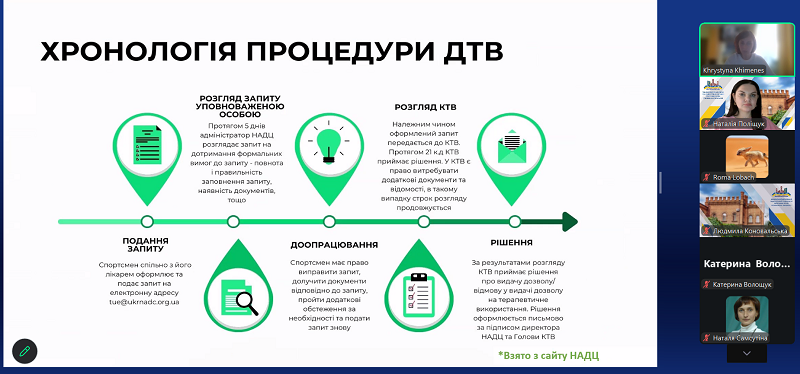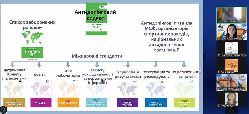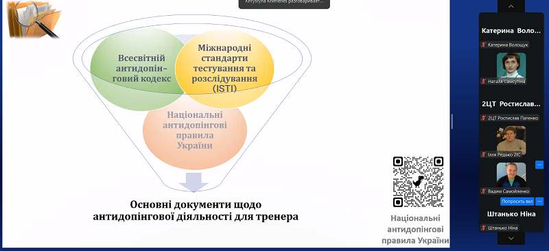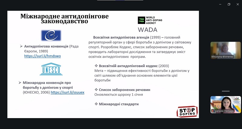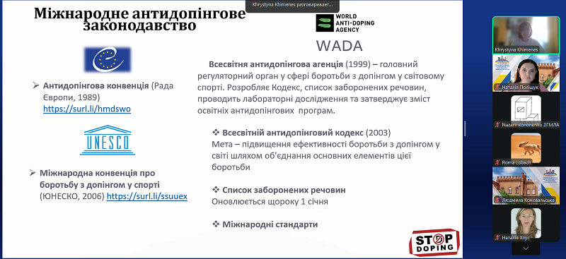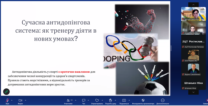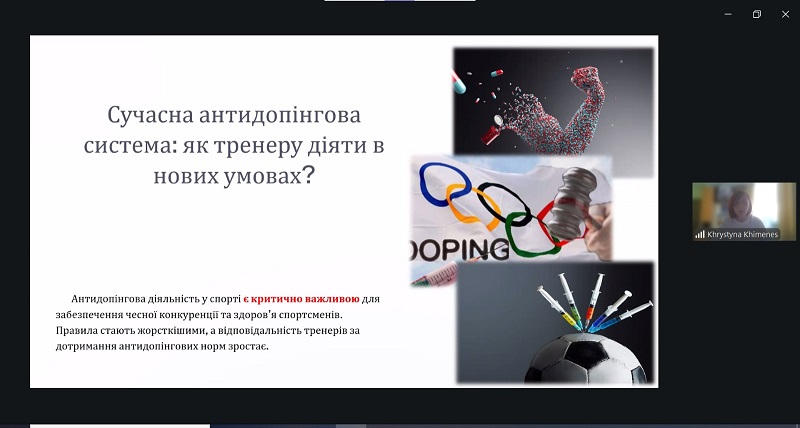 Під час лекції здобувачі освіти ознайомилися із сучасними підходами до організації антидопінгової діяльності, особливостями нормативного регулювання у сфері спорту, а також із практичними аспектами роботи тренера в контексті дотримання принципів чесної спортивної боротьби. Особливу увагу було приділено відповідальності тренера за формування у спортсменів культури доброчесності, обізнаності щодо антидопінгових правил і вміння діяти відповідно до сучасних міжнародних стандартів.