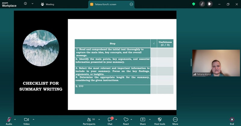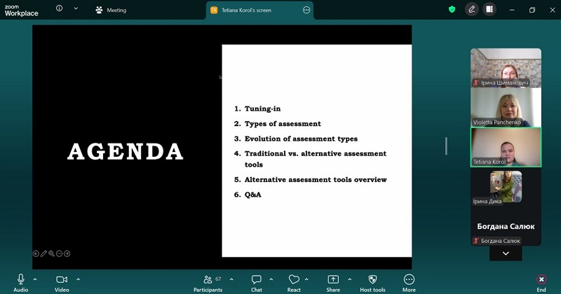 The lecture was delivered by Tetiana Hryhorivna Korol, Doctor of Pedagogical Sciences, Associate Professor at the Department of General Linguistics and Foreign Languages of the National University “Yuriy Kondratyuk Poltava Polytechnic.” Dr. Korol is a recognized expert in English language teaching methodology and assessment practices.