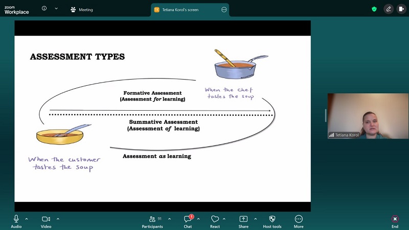 Тетяна Григорівна розпочала лекцію з інтерактивної розминки, запропонувавши учасникам поміркувати над власним досвідом у ролі студентів, яких оцінюють. Далі вона представила запам’ятовувану метафору для розуміння видів оцінювання — аналогію з дегустацією супу: формувальне оцінювання — це кухар, який куштує суп під час приготування, а підсумкове — клієнт, який пробує готову страву.