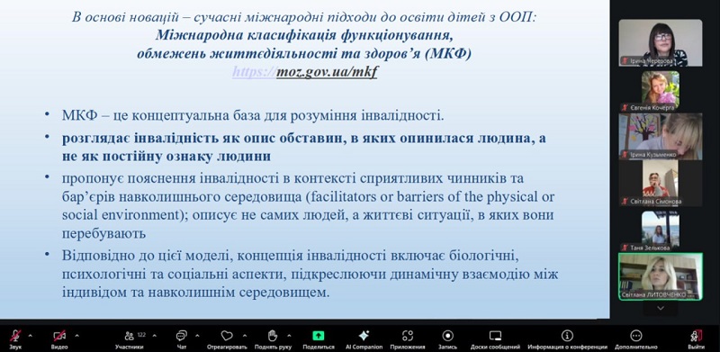 В ході лекції слухачі ознайомилися зі специфікою, напрямами та нормативною базою діяльності інклюзивно-ресурсного центру, сучасними підходами до освіти дітей з ООП на основі соціальної моделі визначення освітніх потреб. Особливу увагу лекторка приділила психологічним аспектам у здійсненні комплексної оцінки розвитку дитини з ООП, висвітлила напрями проведення комплексної оцінки, зупинилася на методиках оцінювання особливих освітніх потреб, як є світовими стандартами діагностики.
