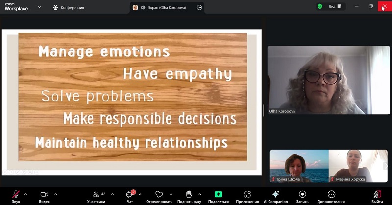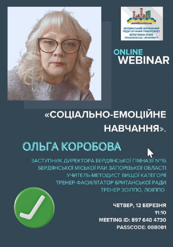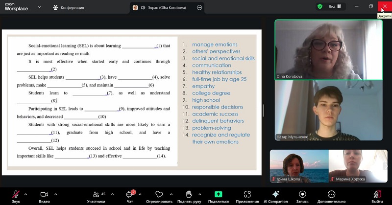 On March 12, 2025, students enrolled in several degree programmes had a unique opportunity to attend an online webinar on Social-Emotional Learning (SEL), organised in collaboration with Berdiansk State Pedagogical University.