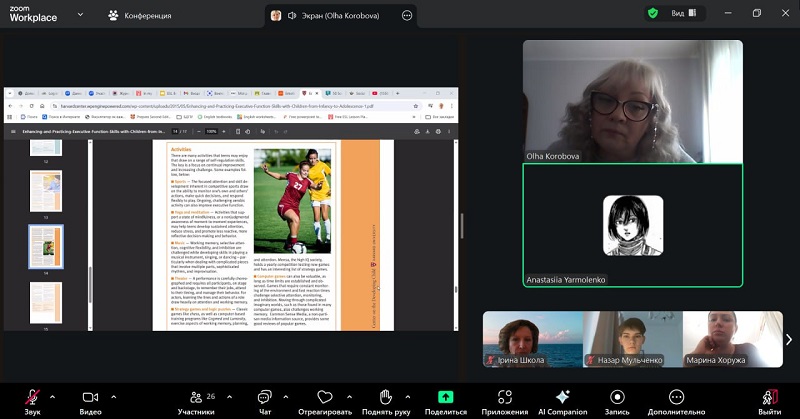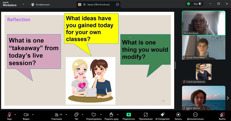 The invited expert was Olha Korobova — Deputy Principal of Berdiansk Gymnasium No. 16 of Berdiansk City Council of Zaporizhzhia Oblast, Teacher-Methodologist of the Highest Category, Trainer-Facilitator of the British Council, Trainer at ZOIPPO and LOIPPO, and participant in numerous international educational projects.