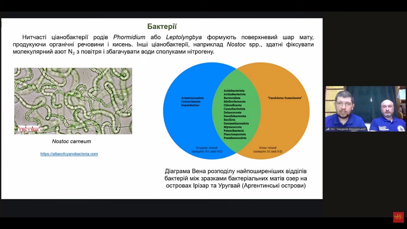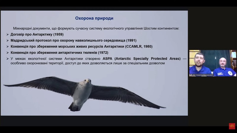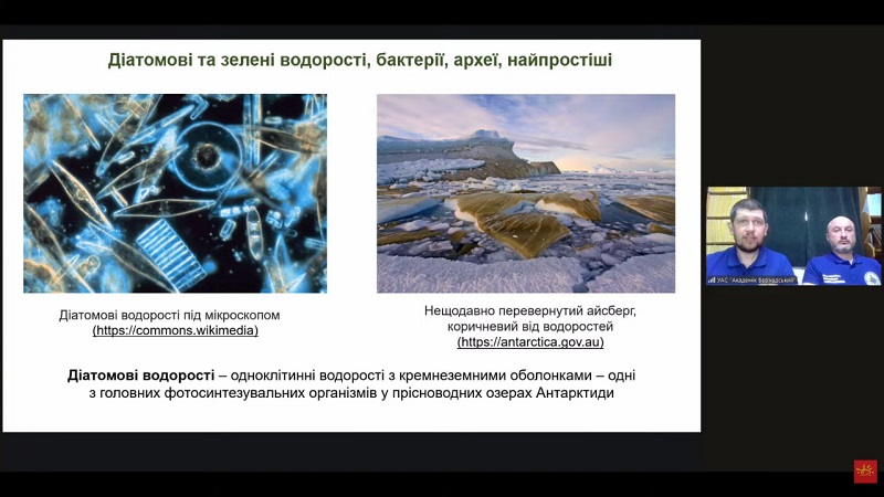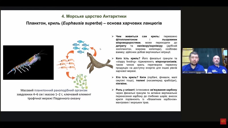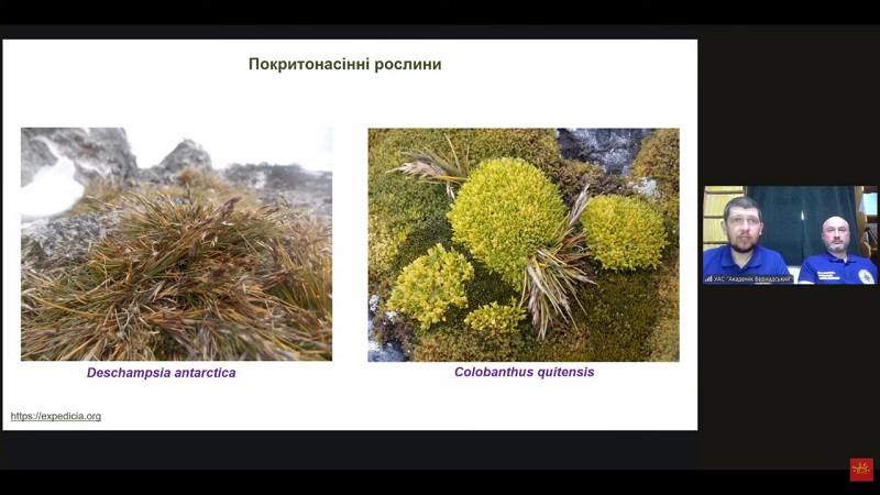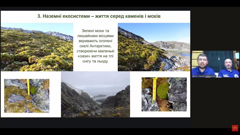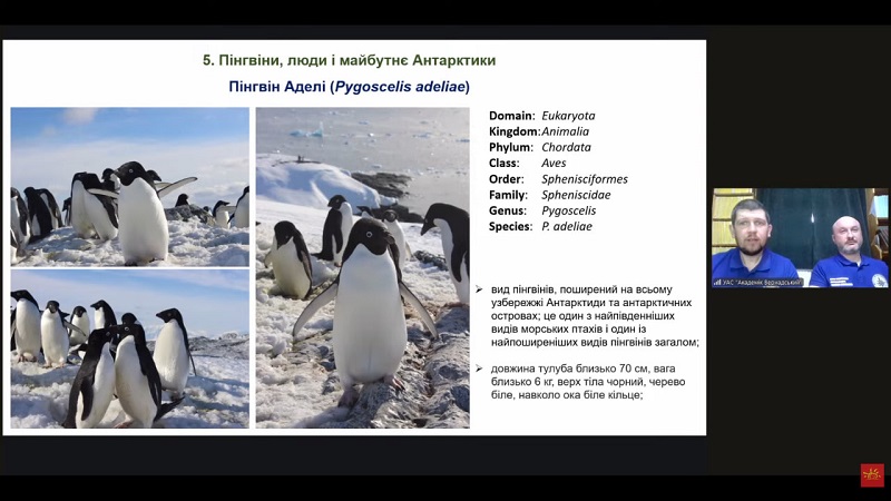 Олександ Полудень розповів присутнім про розташування, кліматичні особливості та історію відкриття Антарктиди, типи льодовиків, які можна тут зустріти, про будову айсбергів, температурний режим, сезонний світловий цикл, антарктичні вітри та метеорологічні дослідження.  Тарас Перетятко розказав про живі організми, які населяють материк – про бактерії, водорості, найпростіших, мохоподібні, лишайники, покритонасінні,  членистоногих, риб, птахів та ссавців, а також про особливості формування природних угруповань та адаптації рослин та тварин до суворого клімату. Особливу увагу вчені приділили питанням охорони природи. Найбільш емоційним та очікуваним моментом прямого включення стала екскурсія територією станції та можливість побачити символ континенту – пінгвінів.