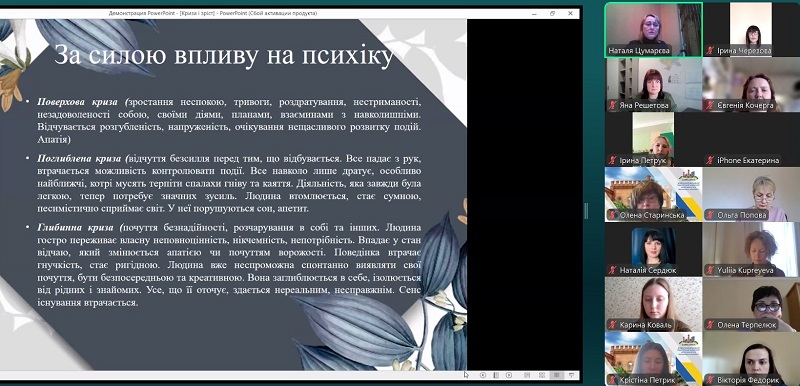 Лекція, яка була організована кафедрою психології факультету ППОМ до Всеукраїнського дня психолога, була лаконічною і цікавою, з використанням презентації, що сприяло ґрунтовному аналізу феномена життєвої кризи, визначенню опорних концепцій і способів переживання криз в умовах війни та поствоєнний період.
