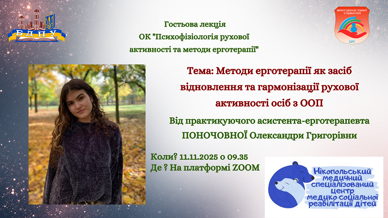 Гостьова лекція з ОК «Психофізіологія рухової активності та методи ерготерапії» для здобувачів першого (бакалаврського) рівня вищої освіти 4 курсу спеціальності 016 Спеціальна освіта факультету дошкільної, спеціальної та соціальної освіти.