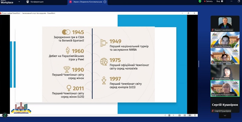 In particular, Vadym Samoilenko, a senior lecturer at the department, in his report revealed an innovative approach to the formation of students’ motor culture through children’s athletics; Lyudmila Konovalska, Master of Sports, Associate Professor of the Department, Candidate of Pedagogical Sciences, presented the topic “Inclusive Sports Without Borders: Methodological Principles of Wheelchair Basketball”. The report of Natalia Samsutina, Master of Sports, Associate Professor of the Department, Candidate of Pedagogical Sciences, was devoted to the topic of using the “Ringo” module as an effective means of implementing a competency-based approach in the physical education of students. All reports aroused lively interest and active discussion among the participants.