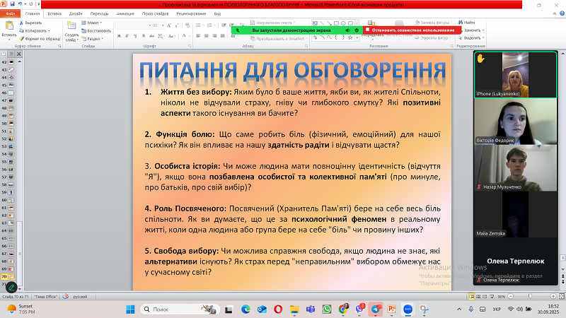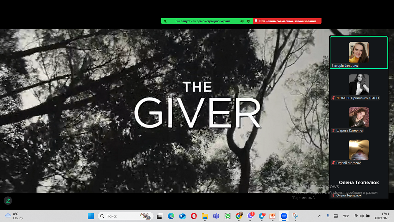 Participants in the film lecture series, along with Viktoriia Fedoryk, a senior lecturer in the Department of Psychology, analyzed the film «The Giver» (2014). The picture immerses viewers in an «ideal future» where, thanks to technological innovations, humanity is forever rid of pain, wars, conflicts, and diseases. However, this seemingly perfect scenario prompts the viewer to realize the high price of tranquility: it is a world devoid of love, happiness, sorrow, or memories.