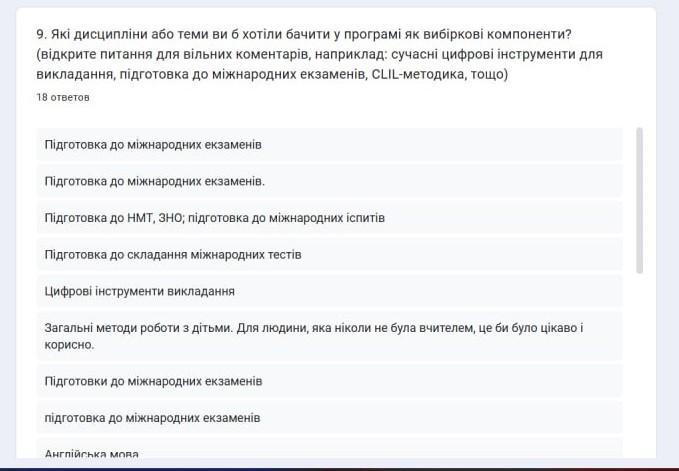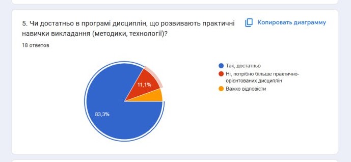 According to the survey results, students highly appreciated the balance of theoretical and practical components of the program, the focus on forming competencies necessary for work in Ukrainian schools, the support of the teaching staff and the availability of the program guarantor for consultations.