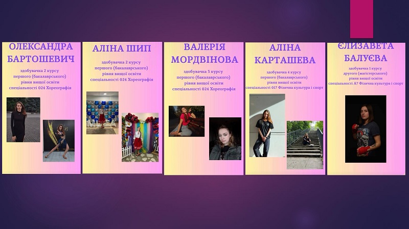 This year, five contestants took part in the first round: second-year students of the first (Bachelor’s) level of higher education, specialty 024 Choreography – Oleksandra Bartoshevych and Alina Shyp; a third-year student of the same specialty – Valeriia Mordvinova; a fourth-year student of the first (Bachelor’s) level, specialty 017 Physical Culture and Sports – Alina Kartasheva; and a first-year student of the second (Master’s) level, specialty A7 Physical Culture and Sports – Yelyzaveta Baluieva.