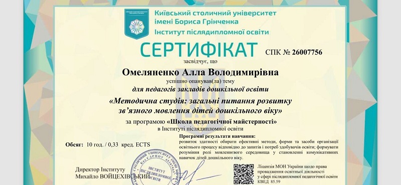 At the invitation of the Institute of Postgraduate Education of Borys Grinchenko Kyiv Metropolitan University, Associate Professor of the Department of Preschool Education of the BDPU Alla Omelyanenko joined the program “School of Pedagogical Mastery”.