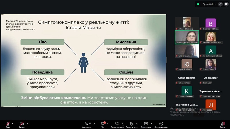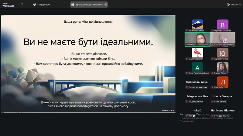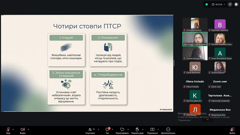 On April 2, Associate Professor of the Department of Pedagogy at the Faculty of Psychological and Pedagogical Education and Arts of Berdyansk State Pedagogical University, Nadiia Dira, delivered an online guest lecture for higher education students of Volodymyr Vynnychenko Central Ukrainian State University as part of interuniversity cooperation. The event focused on the актуальна topic «First Response to Post-Traumatic Stress Disorder (PTSD) and Acute Stress Disorder (ASD)» and aimed to enhance the professional competence of specialists in the field of psychological support.