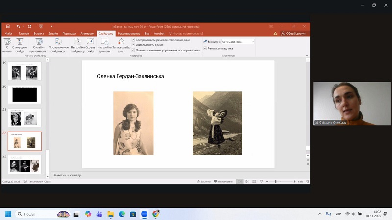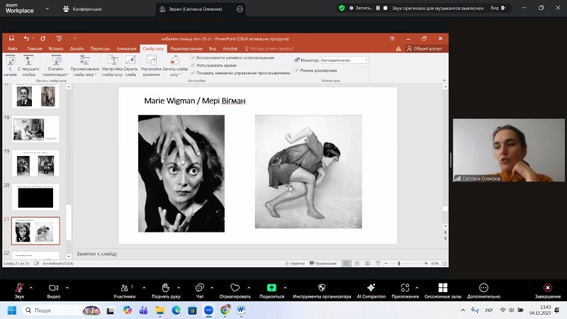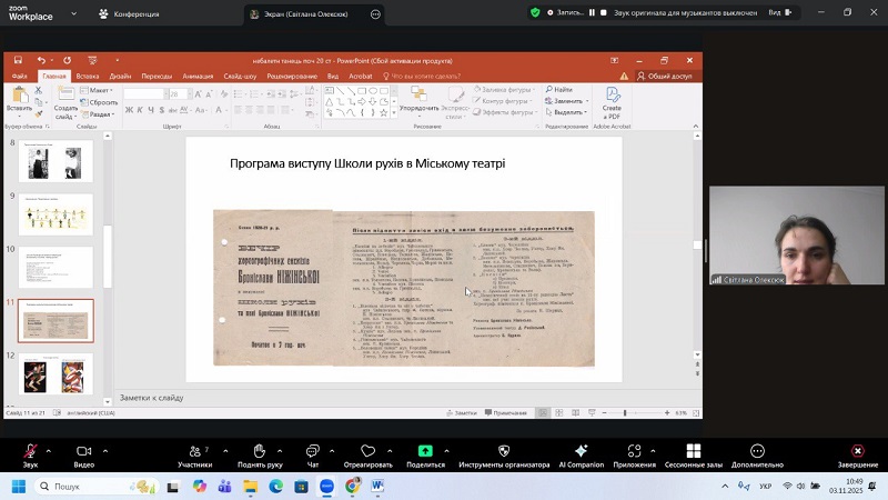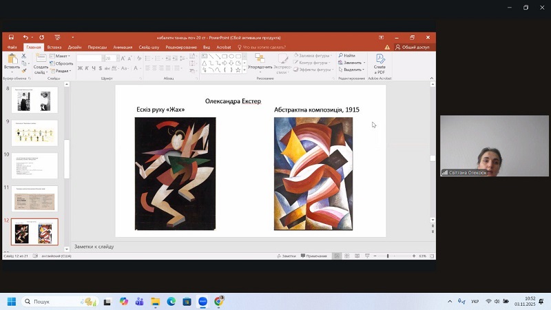 Throughout the meetings, students not only learned unique historical facts and little-known sources but also discussed the origins of modern dance, the development of non-ballet forms, and their influence on the formation of Ukrainian stage traditions. The lecturer’s lively and emotional presentation encouraged active dialogue, inspired students to pursue their own research, and deepened their understanding of artistic processes of the early 20th century.