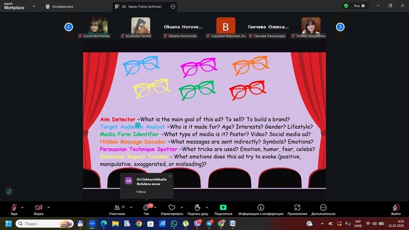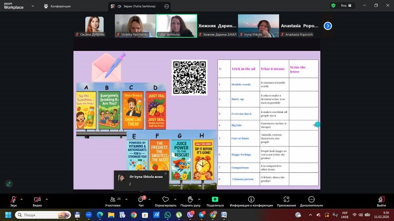 The workshop focused on practical aspects of developing students’ media literacy through the integration of media into English language lessons. Ms. Khomiakova shared her own cases developed within her teaching practice, including award-winning projects from All-Ukrainian media literacy competitions. Participants learned how to use media for critical content analysis, countering misinformation, developing critical thinking skills, and fostering students’ creative self-expression in the digital environment.