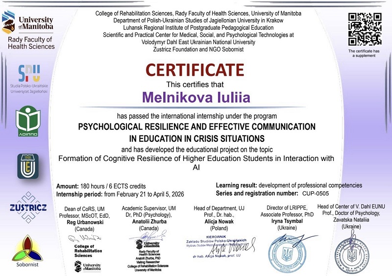 Не менш вагомим є і досвід доцентки Юлії Мельнікової, яка у квітні 2026 року завершила міжнародне стажування «Психологічна стійкість та ефективна комунікація в освіті в умовах кризових ситуацій». Програма тривала з 21 лютого по 5 квітня та також охоплювала 180 академічних годин (6 кредитів ЄКТС). Стажування було реалізоване у співпраці провідних освітніх і наукових інституцій: Університету Манітоби (Канада), Ягеллонського університету (Польща), Луганського регіонального інституту післядипломної педагогічної освіти та Науково-практичного центру медико-соціальних і психотехнологій Східноукраїнського національного університету імені Володимира Даля. Такий міжнародний консорціум забезпечив міждисциплінарний підхід і високий рівень змістового наповнення програми. Ініційована та реалізована під керівництвом Анатолія Журби, PhD (психологія), програма об’єднала провідних науковців і практиків із Канади, Польщі та України. Серед її розробників – декан Коледжу реабілітаційних наук Університету Манітоби Реґ Урбановські, завідувачка кафедри Польсько-Українських студій Ягеллонського університету професор Аліція Новак, а також знані українські фахівці у галузі психології та педагогіки.