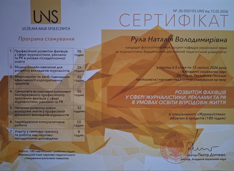 Доцентка Наталія Рула стала учасницею міжнародного стажування «Розвиток фахівців у сфері журналістики, реклами та PR в умовах освіти впродовж життя», яке проходило в дистанційному форматі в місті Лодзь (Польща) у період із 5 січня по 15 лютого 2026 року. Програма була зосереджена на сучасних підходах до підготовки фахівців у сфері медіа, розвитку медіаосвіти та обміні міжнародним досвідом організації освітнього процесу. У центрі уваги – інноваційні методики навчання, нові формати взаємодії зі студентами, актуальні тенденції розвитку журналістики, реклами та зв’язків із громадськістю.