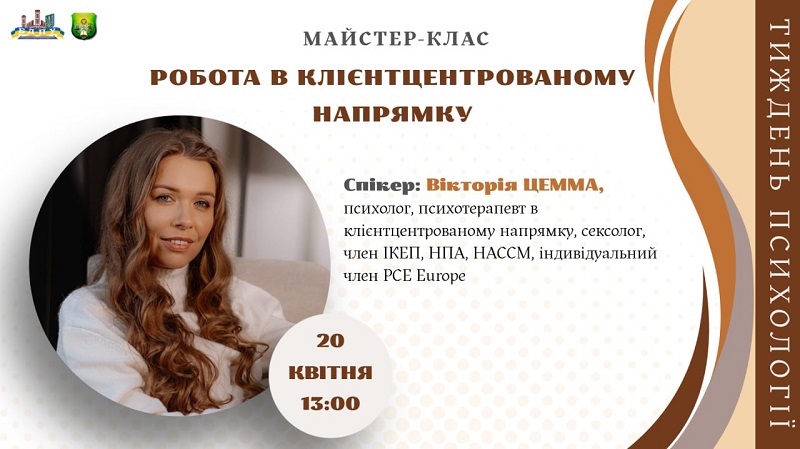 Розпочався тиждень майстер-класом «Клієнтцентрована психотерапія: суть підходу та техніки роботи», спікеркою якого виступила Вікторія Цемма – психолог, психотерапевт клієнтцентрованого напряму, сексолог, членкиня професійних вітчизняних та міжнародних асоціацій.