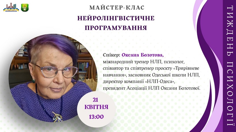 Neuro-Linguistic Programming as a branch of cognitive psychology was presented by Oksana Bolotova, an international NLP trainer, psychologist, co-author and co-trainer of the “Three-Level Training” project, founder of the Odesa NLP School, director of “NLP-Odesa,” and president of the Oksana Bolotova NLP Association.