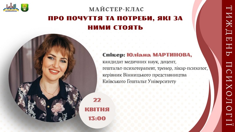 Майстер-клас «Про почуття та потреби, які за ними стоять» провела Юліана Мартинова, кандидат медичних наук, доцент, гештальт-психотерапевт, тренер, лікар-психолог, керівник Вінницької філії Київського Гештальт Університету.