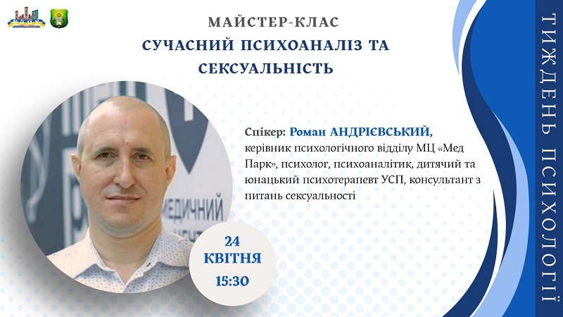 Завершився Тиждень психології майстер-класом «Сучасний психоаналіз та сексуальність» від Романа Андрієвського, керівника психологічного відділу медичного центру «Мед Парк», психолога, психоаналітика, дитячого та юнацького психотерапевта Українська спілка психотерапевтів, консультанта з питань сексуальності.