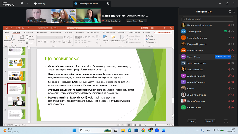 Based on the discussion, ways to optimize the activities of the Leadership School were also identified as a tool for developing leadership potential, strategic thinking, communicative capacity, emotional intelligence, and adaptability of future professionals. Particular attention was focused on the expediency of strengthening digital visual communication and informational promotion of the department’s activities and educational programs among target audiences as a strategically important component of ensuring their competitiveness, increasing recognition, and strengthening positioning within the educational landscape.