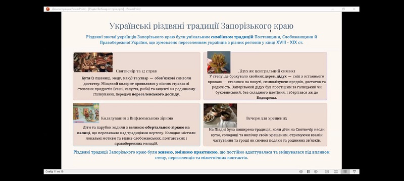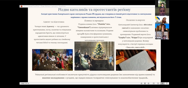 During the event, the specifics of the formation of Christmas rituals in the region were highlighted in the context of historical processes, ethno-confessional interactions, and the cultural diversity of the Zaporizhzhia region. This approach allowed participants to see history not as an abstract discipline but as a living tool for analyzing social processes, directly linked to modern professions.