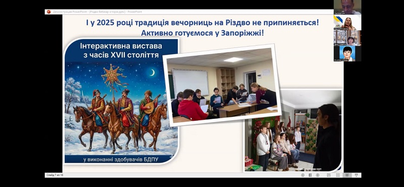 On December 23, 2025, as part of career guidance activities with school students from the Zaporizhzhia region, the Department of History and Philosophy at Berdiansk State Pedagogical University, with the participation of the Dean of the Faculty and the Deputy Dean for Educational Work, held a cultural and educational event titled “The Diversity of Christmas Traditions in the Zaporizhzhia Region.” The event was aimed at fostering a conscious interest among young people in educational programs in the social and humanitarian fields.